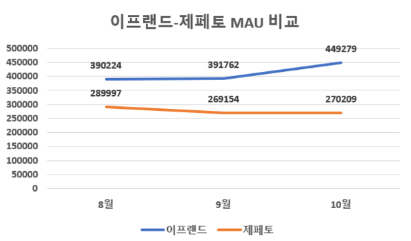해당 그래프는 모바일 이용자만을 집계한 수치입니다. 제페토는 PC버전이 활성화되어 있기 때문에 정확한 비교가 될 수는 없습니다. 모바일 이용자의 8,9,10월 활성 이용자 MAU는 이프랜드의 성장이 두드러집니다. 내년 SK코인과 연결되게 된다면 더욱 파급력이 있을 것이라 예상합니다.